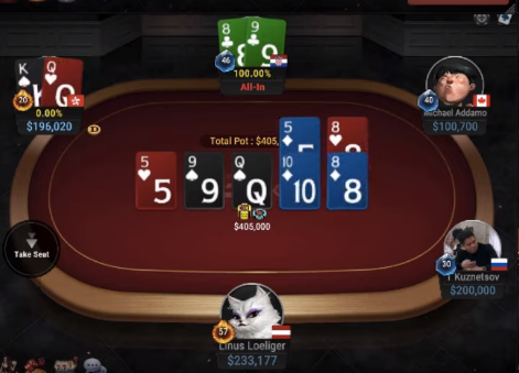 8♦在河牌出现,波兰高额桌牌手的运气非常好,405,200美元的巨额彩池在只有3张补牌的情况下被分成了两半。
