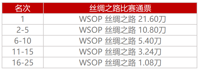挑战流程:透过WSOP金手链免费直通车,进入奖励圈前25名可获得丝绸之路1至21刀门票,玩家再透过WSOP丝绸之路比赛争取WSOP任意金手链赛事冠军。