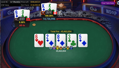 最后一手牌Idris Ambraisse拿到了9d9c,不幸的是他碰上了Jeffrey Dobrin的KcKd,公共牌发出6h2d8d3c5d,Jeffrey Dobrin的对K成功坚持到了河牌,将一条WSOP金手链以及201,666.73的奖励收入囊中。