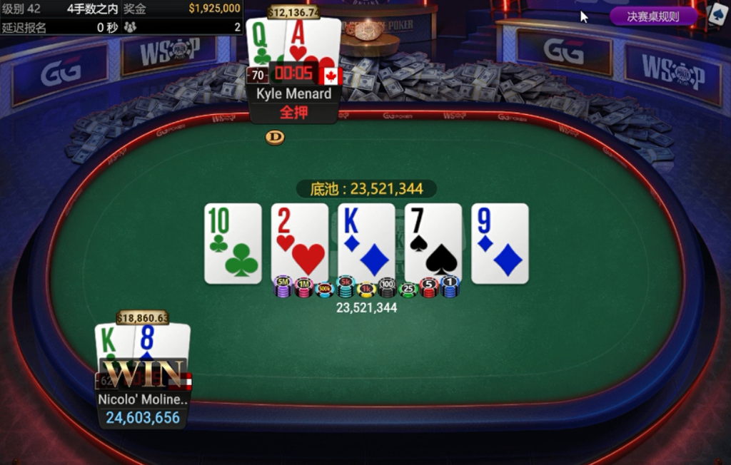 最终Nicolo' Molinelli和Kyle Menard两位选手来到单挑,Nicolo' Molinelli处于领先位置。最后一手牌翻牌前Kyle Menard加注90万,Nicolo' Molinelli跟注。翻牌:10c2hKd,Kyle Menard下注60万,Nicolo' Molinelli过牌加注到188.5万,Kyle Menard跟注。转牌:7s,Nicolo' Molinelli下注221.75万,Kyle Menard跟注。河牌:9d,Nicolo' Molinelli过牌,Kyle Menard全下670万,Nicolo' Molinelli跟注。摊牌,Nicolo' Molinelli:Kc8d顶对,Kyle Menar:AhQc高牌,Nicolo' Molinelli赢得了本场比赛的胜利。