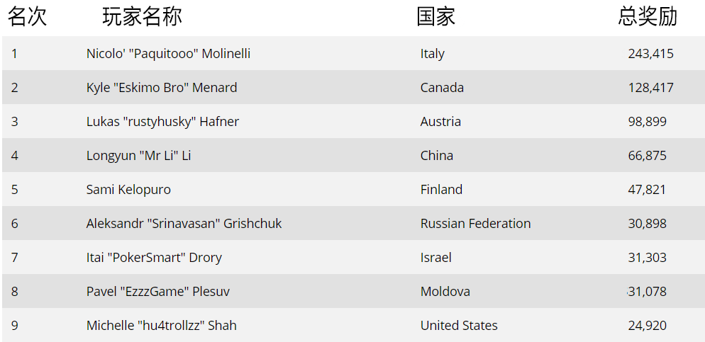 中国选手Longyun Li成功打进本场比赛的决赛桌,取得了第4名的好成绩,收获总奖励66,875。这场亚洲玩家首选赛事共吸引了1,925人次参赛,创造了1,925,000的总奖励,其中奖励人数为278人。