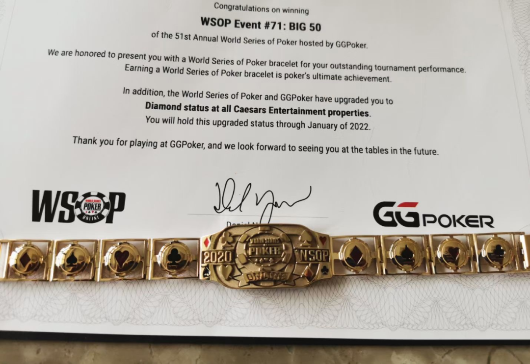 「WSOP Big 50冠军冯华欢的荣耀金手链,上头还有丹牛亲笔签名」
