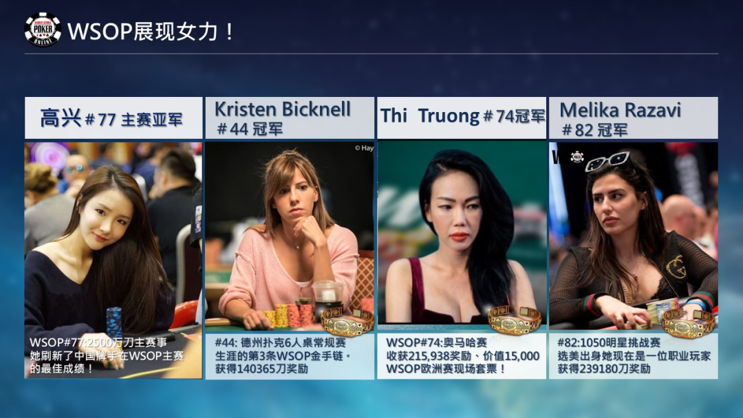 这次GG扑克WSOP线上赛女选手的部份也获得相当傲人的成就,总共有三位职业选手赢得了冠军金手链,分别是赛事#44:Kristen Bicknell这已经是她第三条金手链了,以及赛事#74:Thi Truong、赛事#82:Melika Razavi。