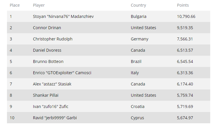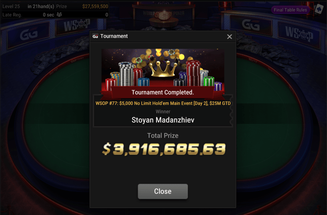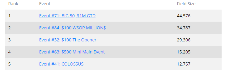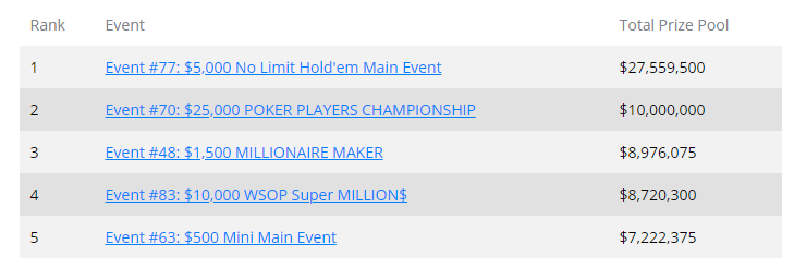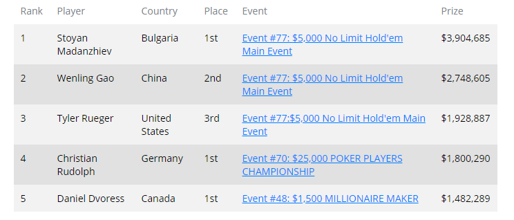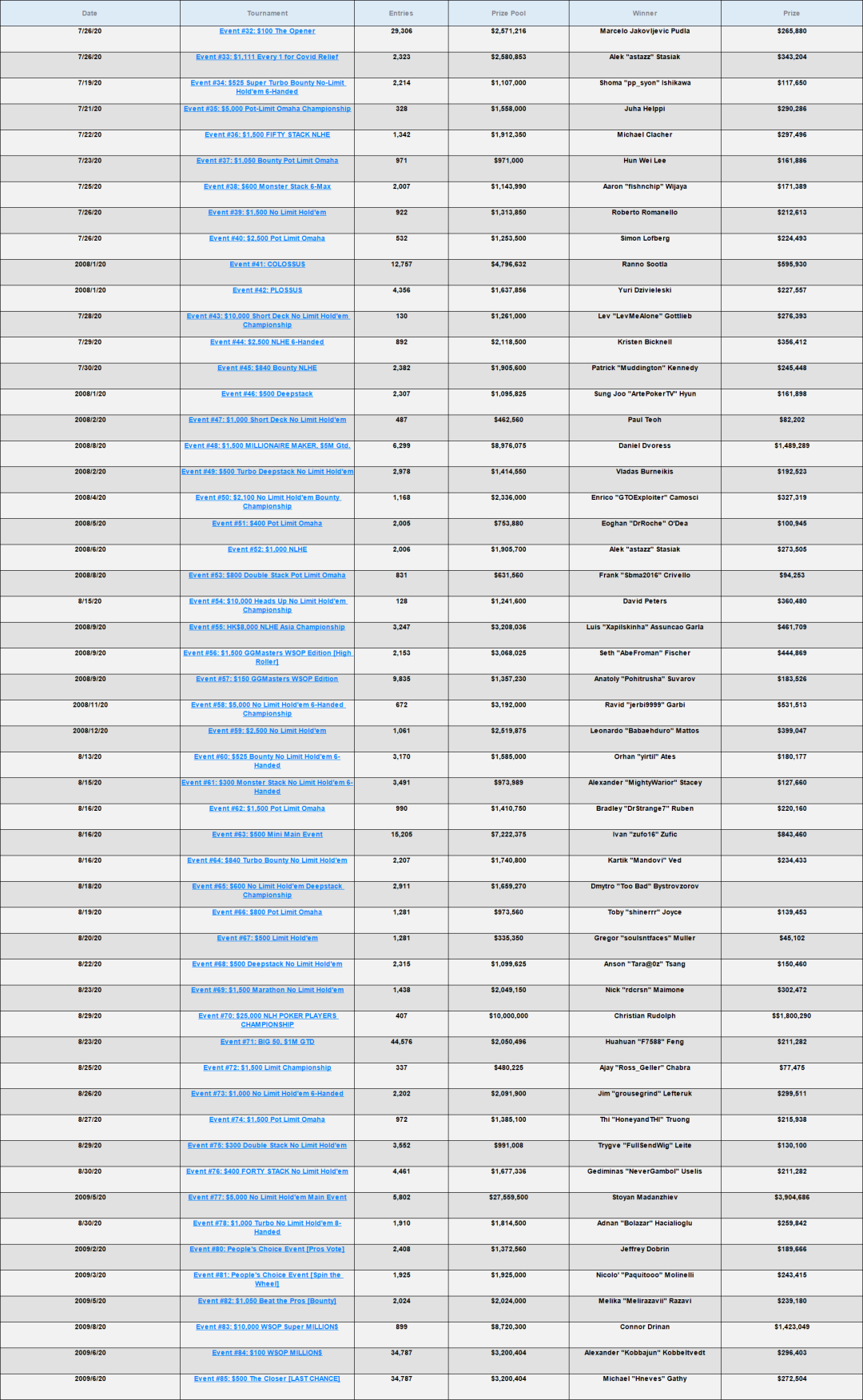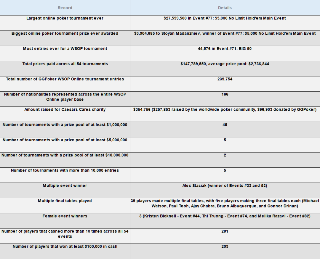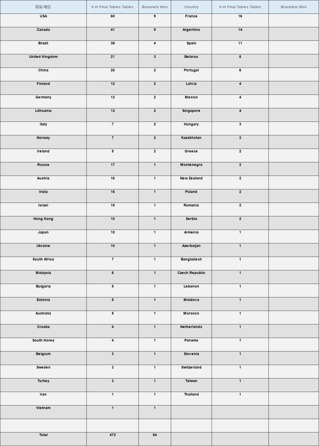 本届WSOP因为疫情影响转为线上举办,分两个平台联合举办,一个是Wsop.com,另一个就是GGPoker。在本届WSOP线上比赛中,GGPoker承办54项赛事,包括最受关注的主赛事,其规模之大相信关注我们报道的人都知道。那它究竟有多大呢?今天,我们就来统计一下今年WSOP的数据: 2020 WSOP线上金手链主赛事是线上比赛史上最大奖池 8月16日起,万众瞩目的2020 WSOP线上金手链主赛事隆重开打,5082名玩家参赛缔造了$ 27,559,500的总奖池,轻松打破了$ 25,000,000的保底奖金。 在破保的同时,前三名的奖金也有所提高,冠军保加利亚选手Stoyan Madanzhiev赢得了3,904,685美元的奖金,这是线上比赛历史上最大的锦标赛奖金。亚军高兴拿下2,748,605美元的奖金成为WSOP历史上获得奖金最高的女性玩家,超过了Vanessa Selbst。 2020 WSOP 五大奖励圈排名 毫无疑问,主赛事的总奖池是本届WSOP系列赛中最高的一个,排在第二高的是赛事#70:$25,000扑克选手冠军赛,总奖池共计$10,000,000;排在第三的是赛事#48:$1,500 百万富翁制造赛,$500 迷你主赛事也进入到总奖池前五高的行列中: 前五大总奖池排名: 由于今年的WSOP变为线上赛,很多人足不出户就可以参与到比赛中,再加上有不少买入低的比赛供其选择,很多低买入的比赛都成功破参赛人数记录,比如令国人为之兴奋的BIG 50,就有44,576人参赛,去年的Big 50参赛人数为22,374人,今年的参赛人数较之去年几乎翻了一倍,另外两项赛事,$ 100 WSOP 百万赛$和$ 100 开幕赛也打破了之前的纪录。 五大破纪录赛事 细节统计 虽说今年改为线上举办会方便很多人,但是由于一些主客观原因,总会有一些地方严令禁止线上平台的比赛,所以很多人为了打比赛,不得不暂时搬到别的地方居住,这里指的更多是美国。因为在美国,WSOP.com仅在内华达州和新泽西州是合法化,但如果还想要参与GGPoker的主赛事,那可能就要涉及到出国打比赛。 虽然条件限制,但美国还是本届WSOP线上金手链赛最大的赢家,在GGPoker承办的54场比赛中,美国就拿下9条金手链,紧随其后的是加拿大,巴西排在第三。 在FT方面,美国人还是进FT人数最多的国家,总共60人成功晋级最后的冠军争夺战,加拿大41人,巴西有38人。总共有来自59个国家/地区的选手进入了54场决赛桌。法国有16人进入过决赛桌,但都没有一条拿到金手链: 主赛事冠军Stoyan "Nirvana76" Madanzhiev应该是本届WSOP GGPoker部分最大的赢家,不仅奖金高,积分也高,10,790.66的冠军积分足以让他排在GGPoker WSOP排行榜第一位。 GGPoker WSOP排行榜前十: GGPoker WSOP亚洲排名前十: 2020 WSOP线上金手链比赛GGPoker 冠军榜: 2020年的WSOP给我们留下了很多美好的回忆,希望明年的WSOP会越来越好。