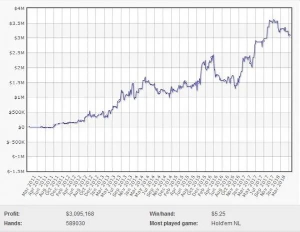 他的HighstakesDB图表看起来非常令人印象深刻。在599,030手牌追踪后,他的盈利为3,095,168美元。这些手牌是在2011年3月到2018年3月之间玩的。这并不意味着他停止了游戏,而是网站停止了对手牌的追踪。