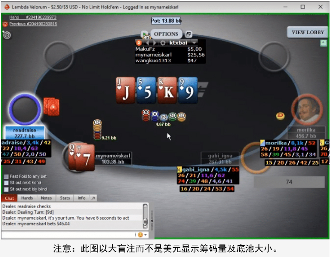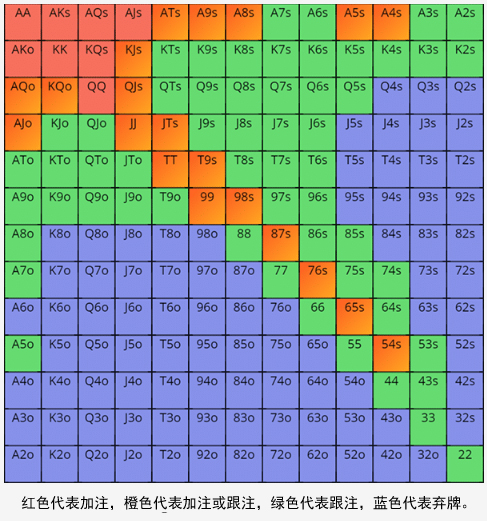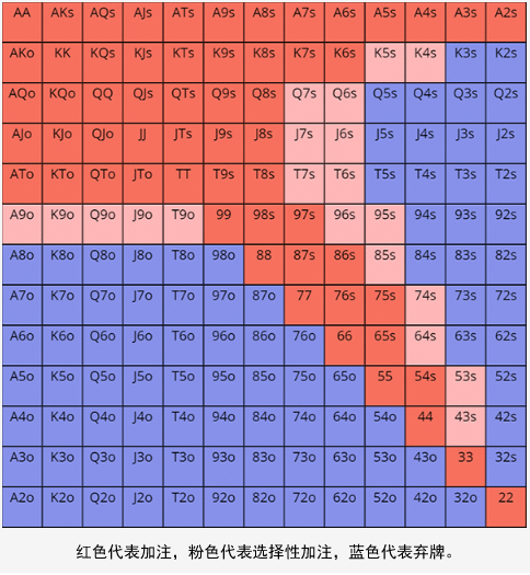 翻牌前:一名叫做readraise的牌手(1150美元筹码)在CO位置率先加注到11美元。Fried在大盲位置拿着Q♥ 7♥,握有 570美元筹码。 分析:Readraise在CO位置应该用最好25%起手牌率先加注。以下是Upswing Lab Chart Viewer应用给出的CO位置率先加注范围。 对抗这样的范围也鉴于Fired得到的极好底池赔率,他应该如下面范围那样用很多牌跟注: 翻牌:K♥ J♥ 5♦,两个牌手都check。分析:Fried选择check,因为他将用他的整个范围这么做。Fried具有范围劣势,而且他也是在不利位置游戏。因此他应该从不在这里领先下注。根据以下PioSolver解决方案,readraise应该主要用中等尺度以较高频率做持续下注。 这种激进持续下注策略可能的原因:readraise有很大的范围优势(56.5% vs 43.5%),而且也有很大的坚果优势。Readraise范围的6.2%部分是两对及更好牌,而这些牌只占Fried范围的4.3%。这种优势允许readraise更有利可图地使用较大下注尺度。 转牌是9♦,使得公共牌面是K♥ J♥ 5♦ 9♦。Fried做两倍底池大小的超额下注(往23美元的底池下注46美元),readraise跟注。 转牌圈分析:当一名牌手在一个应该以极高频率下注的公共牌面随后check时,这往往意味着他的范围是比较强的,而且倾向于具有摊牌价值的牌。对抗这样一个范围,Fried仍然在胜率上落后,但他现在具有坚果优势。这允许他采用一种有利可图的超额下注策略。虽说如此,根据PioSolver软件,这并非Fried在这种处境下的主流策略。 Solver很少选择超额下注,只在4.68%的时候这么做。但是,Fried的特定底牌应该频繁做超额下注。在上图右边你可以看到Solver喜欢在20.7%的时候用Q♥ 7♥超额下注。 Solver也选择用超强听牌(比如坚果同花听牌和组合听牌)做高频超额下注。这可能是因为这些牌有很高胜率,而且往往会在河牌圈改进成超强牌,在这个时间点Fired可以为了价值做超额下注。 附注:实际上,这种低频超额下注策略很可能比Solver建议的策略更好。人类不会像Solver那样接近平衡和不可剥削,因此对手很可能对超额下注频繁弃牌。 河牌圈:6♠,公共牌面定格为K♥ J♥ 5♦ 9♦ 6♠。Fried选择继续做两倍底池大小的超额下注(往115美元的底池下注227美元)。 河牌圈分析:如果Fried在转牌圈超额下注,他是两极化自己的范围(这意味着他要么是一手强牌,要么是一手诈唬牌)。当所有听牌都错过时,继续超额下注是合理的,因为他在代表相同的两极化范围。这个范围由强价值牌(两对及更好牌)和各种破灭的同花听牌组成。 当你的大多数听牌错过时,你应该放弃你的一些诈唬牌。在本例中因为所有听牌都错过,Fried应该用他的一些听牌诈唬,但放弃大多数听牌。然而,因为我们并非对抗完美平衡的扑克之神,我们的策略往往应该转变为利用我们认为的对手的弱点。这是剥削性策略可以派上用场的地方。 在类似这样的场合决定是否诈唬时,我们应该考虑下列情况: l 对手的倾向(他是跟注站还是紧弱玩家?) l 我们最近对抗该对手的历史(他在这个session中已经抓到你几次诈唬?) l 对手最近的状态如何(他正在上头吗?他愿意随意跟注吗?) l 我们收集到的关于对手的任何其他信息。 牌局结果 Readraise弃牌,Fried拿下一个115美元的底池。这就是本文的所有内容,感谢阅读!祝你桌上好运!