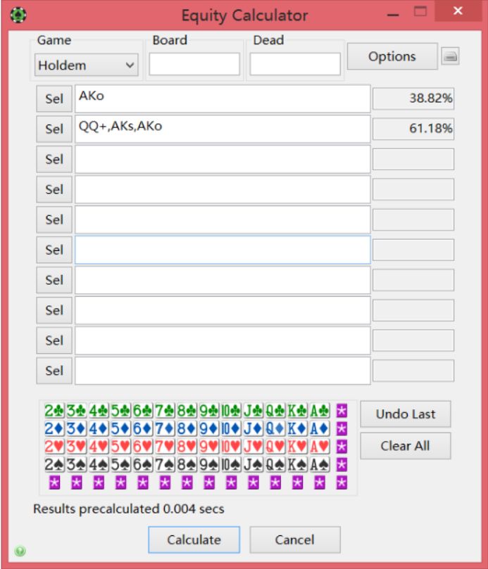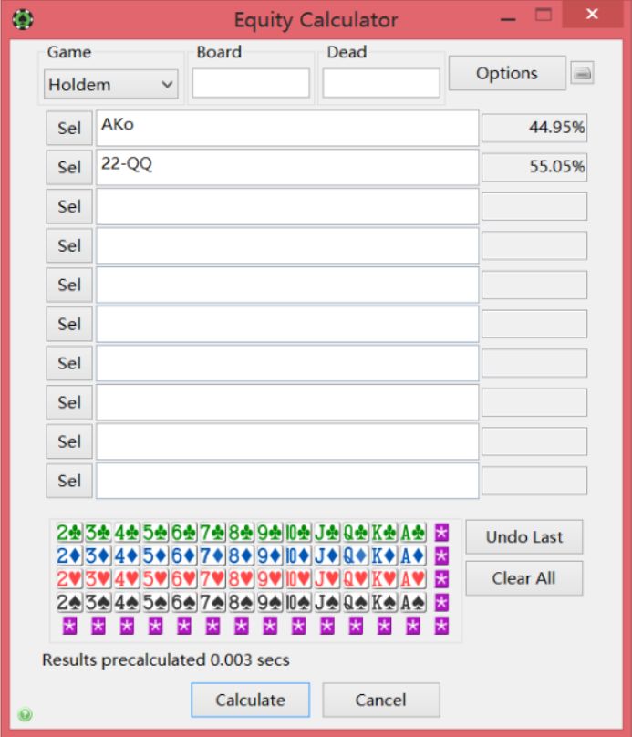 举个例子,QQ+与AK占2.56%,如果对手的4BET范围超过4%,我们进行5BET的shove就是不吃亏的,如果在5%以上的话那就必须对他进行5BET全下。另外考虑到是盲注战,可能对手的范围会更宽一些。