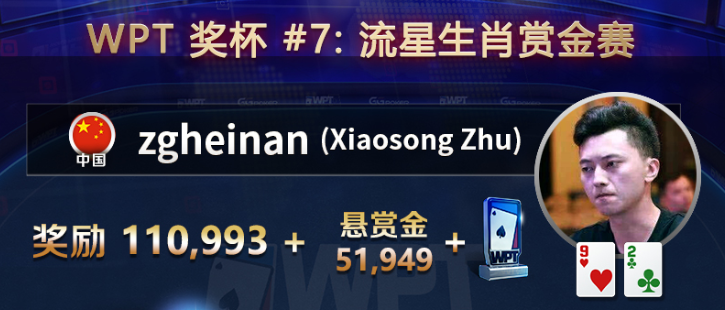 北京时间10月10日20:00开打的WPT奖杯 #7: 流星生肖赏金赛,恭喜国人再度获得冠军,这场比赛总共吸引了697玩家报名,中国玩家的成绩也相当亮眼,除了冠军冠军- Xiaosong Zhu ( 祝小淞 )之外,前5名都是由国人霸占!