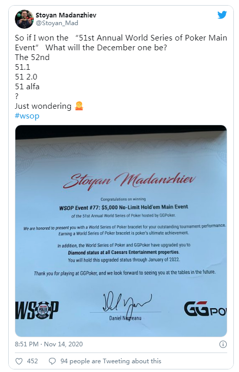 然而,5000美元WSOP线上主赛事的冠军Stoyan Madanzhiev对举办另一场主赛事的决定表示困惑。