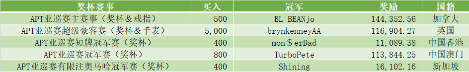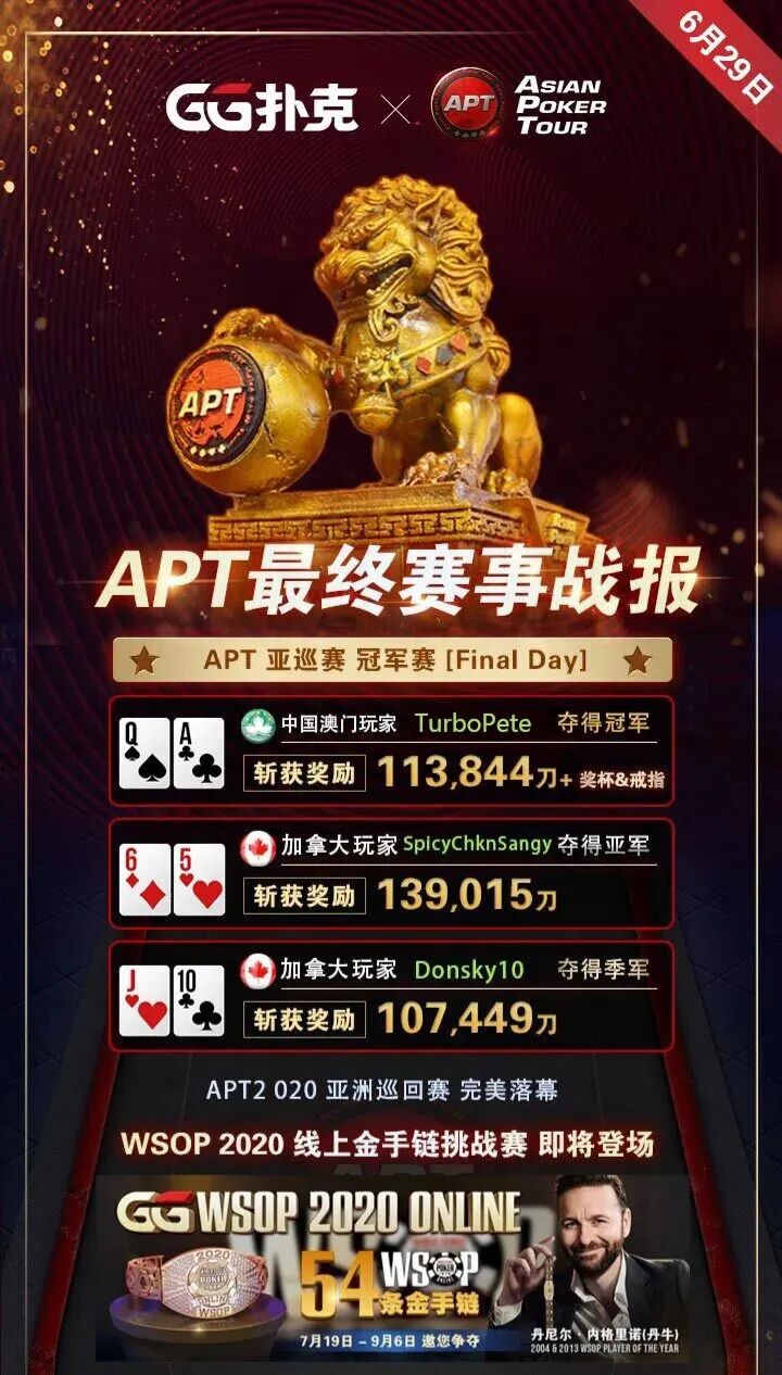 北京时间2020年6月28日晚上21点,备受广大玩家瞩目的APT亚巡赛冠军赛Final Day正式开打!这场赛事共吸引了1,351人次参赛,奖励突破保底达到了1,026,760。其中冠军不仅可以收获161,275.12头奖,还将获得金狮奖杯和冠军戒指。在比赛还剩三人的时候中国澳门选手“TurboPete”和加拿大选手“SpicyChknSangy”、“Donsky10”达成协议,每人都能获得100,000+的巨奖。经历了七个半小时的战斗最终中国澳门TurboPete登顶了本场比赛的冠军收获奖励113,844.25,将金狮奖杯和冠军戒指收入囊中。 在晚上21点另外两场有金狮奖杯的比赛APT亚巡赛短牌冠军赛和APT亚巡赛有限注奥马哈冠军赛也相继开赛。 APT亚巡赛有限注奥马哈冠军赛共吸引了221人次参赛,总奖励达到了83,096轻松破保。这场比赛共持续了近11个小时,最终新加坡选手“Shining”击败英国选手“kid1591”登顶本场比赛的冠军,夺得一座金狮奖杯并收获奖励16,102.16。中国选手“biebbwo”成功打进决赛桌,取得了第9名的好成绩收获奖励1,562.86。 APT亚巡赛短牌冠军赛共吸引了143人次参赛,最终的总奖励也突破保底达到了53,768。最终中国香港选手“mon$erDad”在单挑中击败马耳他选手“BigBallsButcher”夺得冠军,收获金狮奖杯和11,089.38头奖。中国选手“cnbmb”和“sheila0703”分别获得第3名和第8名。 APT亚巡赛最后一场的比赛APT终结赛共吸引了237人次参赛,最终加拿大选手“HannibalBarca”获得了闭幕之战的冠军,收获奖励17,106.93。至此本次APT系列赛圆满落幕,感谢广大玩家的参与! APT奖杯赛事冠军一览 WSOP 2020线上系列赛 众所期待 即将来袭! WSOP线上系列赛将以5000刀无限注德州扑克主赛事为主轴,该赛事保底高达破纪录的2500万奖励。这项大型比赛将于8月16日开始,与之前的实体牌桌赛活动类似,将有多个此类型的赛事在GGPoker平台线上进行,而Day2将于8月30日开始。 GG扑克WSOP 2020线上系列赛亮点! ●WSOP 54条冠军金手链 ●主赛事保底高达2500万保底奖励 ●中国专属赛事时间与中文直播解说 ●WSOP有史以来最低参赛金 ●WSOP排行榜订制纯金纪念品 WSOP微型赛7月1日即将展开!人人都可实现梦想 对卫星赛感兴趣的玩家注意了,赛事将从7月1日开始,并计划在整个WSOP线上系列赛中进行,无论奖励大小如何,所有玩家都有机会轻易地参与到WSOP金手链赛事。