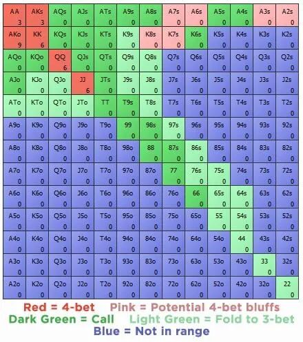 巧妙利用阻断牌效应可以使你的诈唬和跟注具有更高的成功率。 阻断牌(blocker)是指:你看到的要么在公共牌面,要么在你手中的牌,它“阻止”了你的对手拿到任何包括那张牌的底牌。 扑克是一种注重小优势的游戏,你通过有效利用阻断牌获得的小优势,将对你的长期盈利产生重要影响。 我敢打赌,几乎每个在2017年赚到至少十万美元的牌手都懂得如何在这三种常见场合利用阻断牌: ● 翻前3bet和4bet诈唬。 ● 跟注翻后下注,特别是抓诈唬时。 ● 翻后将包含阻断牌的成手牌转变成诈唬牌。 我们将在本文中概述所有三个场合,也会提及阻断牌有多重要。 1. 在翻前诈唬时考虑阻断牌效应 你是否不确定翻前拿哪些牌做3bet诈唬或4bet诈唬?阻断牌可以让这些决策更清晰。 当我们构建我们的翻前范围时,我们应该使用某些阻断了对手价值下注范围的底牌。通过选择一手有阻断能力的牌,我们的诈唬不太可能撞到一手强牌,从而使我们的诈唬更容易成功。 我们来查看一个翻前的例子,用范围拆解来论证阻断牌效应是如何奏效的。 假设CO位置叫做Gabriel的牌手率先加注到2.5BB,然后我们在按钮位置做7.5BB的3bet。以下是Gabriel的率先加注范围对于我们的3bet可能的预期反应。 (说明:红色方格代表4bet,粉色方格代表有可能做诈唬4bet,深绿色方格代表跟注,浅绿色方格代表弃牌,蓝色代表不在范围中。方格右下方的数字表示4bet牌的组合数。) 如果我们从组合数角度来拆解这个范围,我们将知道Gabriel的范围包括40种几乎肯定对我们4bet的强牌组合(JJ+、AKs和AKo)。 现在,假设我们选择用A♥ 2♥做3bet。以下是我们底牌的排除效应对于Gabriel总共价值牌组合的改变(注意每个红色方格右下方的小数字)。 (说明:红色方格代表4bet,粉色方格代表有可能做诈唬4bet,深绿色方格代表跟注,浅绿色方格代表弃牌,蓝色代表不在范围中。方格右下方的数字表示4bet牌的组合数。) 当我们用A♥ 2♥做3bet,底牌排除效应产生作用时,Gabriel作为价值下注的4bet范围的组合数减少了17.5%(从40到33)。具体地说,我们的对手: ● 拿到AA的可能性减少50%(从6种组合到3种组合)。 ● 拿到AKs的可能性减少25%(从4种组合到3种组合)。 ● 拿到AKo的可能性减少25%(从12种组合到9种组合)。 拿着这手牌,我们也可以考虑到我们阻断了对手跟注范围中某些最强的牌(AQ、AJ和AT) 同样,遭遇3bet时,像同花A高牌(有时甚至是非花A高牌)这样的牌可以很好地充当4bet诈唬牌,因为它们阻断了上面列出的三种牌(AA、AKs和AKo)。 显然,根据底牌排除效应去选择我们的翻前诈唬牌平均而言将产生较高的成功率。 2. 在抓诈唬时考虑阻断牌效应 这是一个经常让人困惑的理论,但其逻辑如下。 当你在跟注和弃牌比较接近的场合面对下注时,你应该考虑你的范围中的哪些牌阻断了对手想代表的价值牌,然后倾向于用这些牌跟注。有时这意味着你应该用一手具有排除效应的牌跟注,而在相同场合放弃一手更强的牌,因为它缺乏排除效应。例如: $1/$2 Cash Game. $200 Effective Stacks Hero is dealt two cards in the SB Flop ($14) 9♥ 8♠ 5♥ Turn ($32) 2♦ River ($82) 3♣ 问题:在下面三手牌中,Hero最可能用哪手牌跟注? 9♦ 6♦ T♦ 9♦ J♦ 8♦ 答案是9♦ 6♦。这手牌阻断了坚果顺子、两对和更好的顶对。就纯价值而言,T♦ 9♦可能是一手更强的牌,但它其实具有负面排除效应——T♦阻断了大盲玩家范围中的很多破灭的顺子听牌。J♦ 8♦则更糟糕,因为它没有阻断顶对组合,而且仍然阻断了破灭的顺子听牌。 谨记,当你构建一个跟注范围时,阻断牌只是一个较小的考虑因素。在上面的例子中,像JJ这样的牌阻断效应很糟糕(它阻断了破灭的听牌,而没有阻断任何价值牌),但它仍然是一手比上述三手牌更好去跟注的牌。这是因为,JJ在这种场合并非一手纯粹的抓诈牌,它其实打败了一些大盲玩家可能做价值下注的牌(A9、K9和Q9)。 3. 将带有阻断牌的成手牌转变成诈唬牌 有时扑克高手会将带有良好排除效应的成手牌转变成诈唬牌,这是大多数弱手往往不情愿去使用的招数。 当你的底牌在河牌圈缺乏摊牌价值,但因为其阻断牌而可以很好地充当诈唬牌时,这种策略特别强大。因为这是一个特别切合实际的主意。我们来看一个例子: PokerStars Zoom $5/$10. 4-Handed. Effective Stacks $631. Hero is on the BTN with 8♣ 8♦ Flop ($48): Q♦ 4♣ 7♣ Turn ($48): T♦ River ($88): 9♠ 这一手牌,我们面对转牌圈和河牌圈的连续下注,选择把88当做诈唬加注牌。 88在我们范围的底端,没有足够的摊牌价值去跟注。但是,它阻断了大盲玩家范围中的两种顺子:86和J8。从对手的角度来看,我们的翻牌圈check和转牌圈跟注意味着我们拿到其中一手牌是合理的(更可能是J8,因为86几乎肯定在翻牌圈做持续下注),而且我们可能在这个河牌面用99、Q9这样的牌加注。 如果我们的范围不包括任何应该在这个河牌面做价值加注的强牌,我们很可能应该从不做诈唬加注。虽说如此,但我们这里的范围中几乎肯定具有强价值牌,因此我们需要选择一些诈唬牌来平衡我们的范围,让我们更难对付。88的两张阻断牌,以及它糟糕的摊牌价值,使得它成为了最好的诈唬牌之一。 不要高估阻断牌的重要性 阻断牌在理想的决策制定中起着重要作用,但我们容易高估它们的重要性。 一方面,我们的阻断牌并不意味着对手不可能拿到被我们阻断的底牌(除非我们拿着特定的同花阻断牌)。