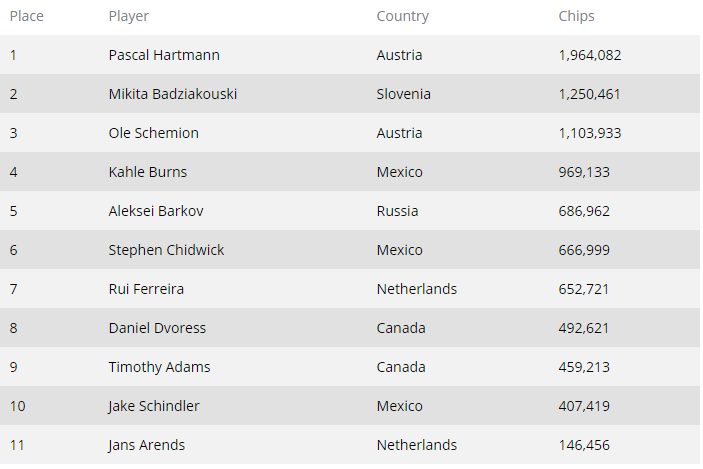 partypoker团队的Mikita Badziakouski是在筹码数量上最接近Hartmann的对手。Badziakouski获得了1,250,461的筹码,是仅有的三位以七位数筹码结束第一天的玩家之一。德国巨星Ole Schemion(1,103,933)排在第三。