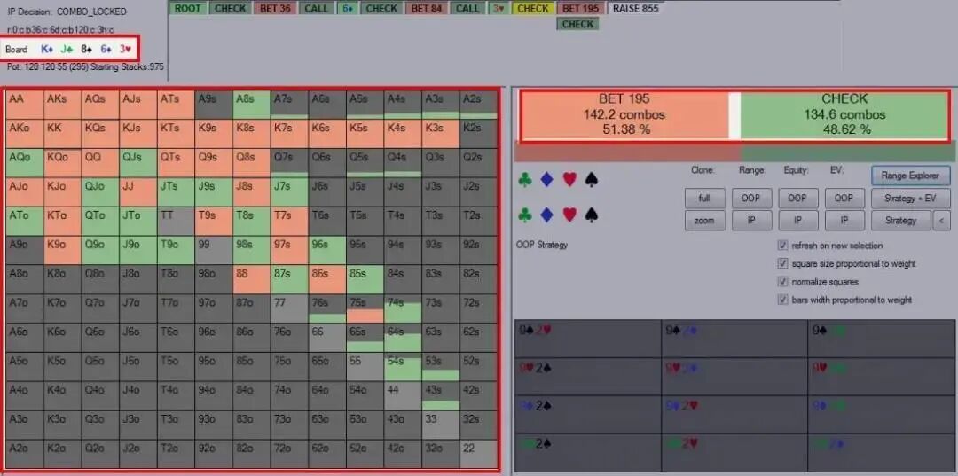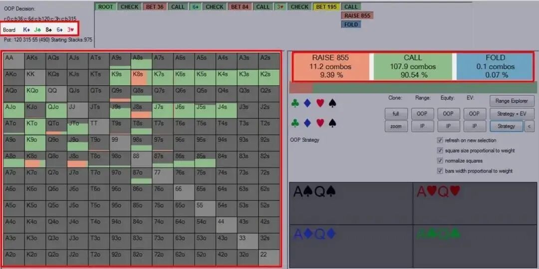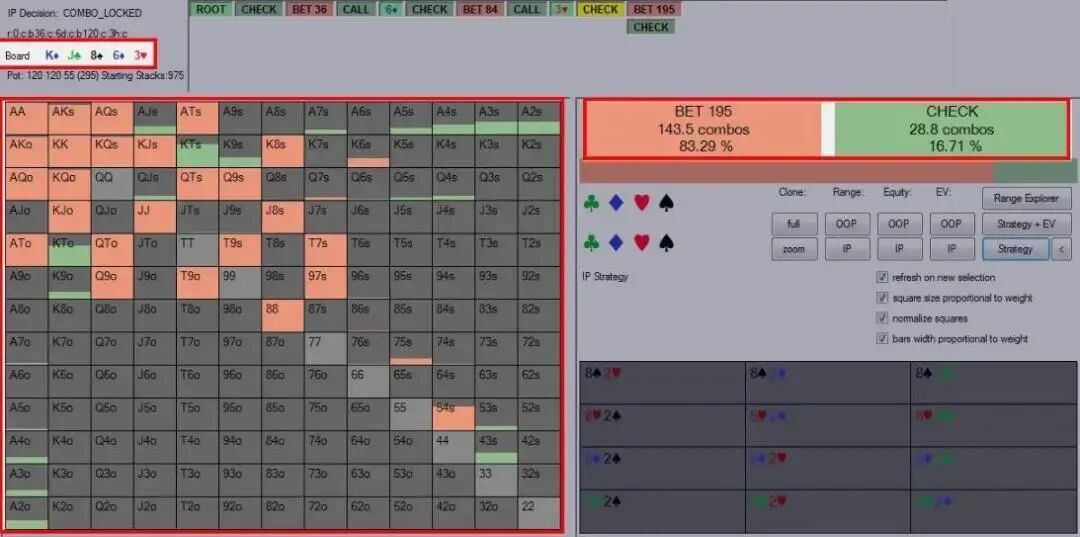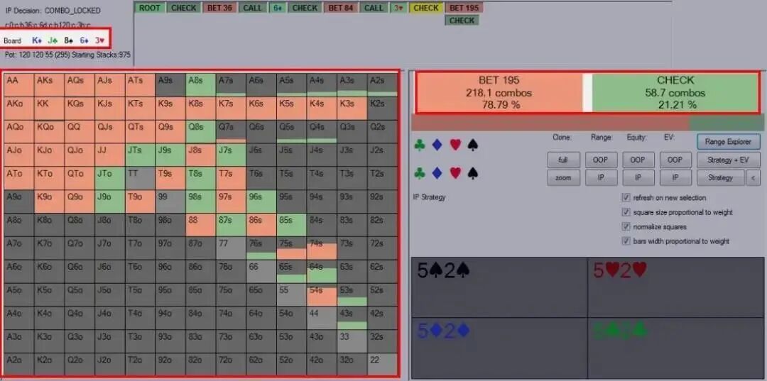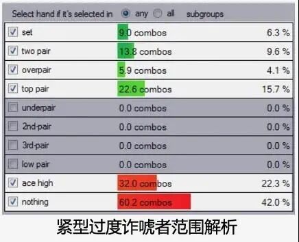 超凶牌手的类型 我们可以把某个超级凶的对手划分到下列三个类型之一: l 紧型过度诈唬者(翻、转、河持续下注频率:60/70/70%)。 这类对手对于他的河牌圈价值下注牌是有选择性的,这意味着他的价值下注将相当紧。另一方面,他的诈唬牌则没那么精挑细选,因为他不希望因为随后check并在摊牌时落败而示弱。因此,他取而用他的所有破灭的听牌再次开火,希望迫使对手弃牌。这类牌手的策略存在的问题是,导致了极扭曲的诈唬价值比,下注范围中的诈唬牌远多于价值下注牌。 l 松型过度诈唬者(翻、转、河持续下注频率:70/80/70%)。 如同紧型过度诈唬者,松型过度诈唬者在下注时也有一个扭曲的诈唬价值比。然而,这种类型的对手在选择价值下注牌时不是那么紧,这很可能是因为他们缺乏相对牌力意识。这类牌手在过度诈唬的同时也会过度价值下注。 l 过度价值下注者(翻、转、河持续下注频率:70/80/50%)。 这类对手类似于松型过度诈唬者,他们没有相对牌力和过度价值下注的意识。然而,过度价值下注者诈唬往往不够多。这类牌手有着很高的连续下注统计数据,展示出一种诈唬过多的激进牌手的形象,但其实这类牌手是用中等强度的牌(比如中对和底对)连续下注。 如何打败每种类型的超凶牌手 既然我们已经给这些牌手分类,我们现在可以开始探索剥削他们的每种游戏倾向的方法。我们首先从一种常规调整开始,也就是说,我们需要改变对抗所有三种类型的牌手的翻牌圈策略。因为他们的翻牌圈和转牌圈的游戏风格极其相似,对抗这三种牌手我们将采用类似方法处理转牌圈。 具体地说,我们应该稍微缩紧我们的check-call范围。我建议这么做是因为我们范围中的弱跟注牌无法承受二次下注和三次下注的压力——众所周知这类牌手喜欢频繁采用这些手段。这里的一个明显调整是放弃弱对子(底对或弱口袋对子),因为它们很脆弱。我们来看一些牌例。 剥削紧型过度诈唬者 Online $0.50/$1. 6-Handed. Effective Stacks $100.00. Hero is dealt two cards in the BB 3 folds. Button (BU) raises to $2.5. sb folds. Hero calls. Flop ($5.5): K♦ J♣ 8♠ Hero checks. BU bets $3.6. Hero calls Turn ($12.70): 6♦ Hero checks. BU bets $8.4. Hero calls River ($29.50): 3♥ Hero checks. BU bets $19.5. Hero…? 以下是对手在河牌圈可能下注的牌: 编者注:一如既往,为方便不熟悉piosolver软件的读者,我们将相关信息用红色方框标记。 我们可以看到,对手将用踢脚第二好的顶对及更好牌下注,这样做本质上是正确的。但他也用几乎所有破灭的听牌下注,因而在这种场合诈唬过多。这使得他有一个诈唬牌占64.3%的极不平衡的河牌圈下注范围。 可能并不意外,我们对抗这类对手的理想方案是用所有抓诈牌跟注: Piosolver建议对抗紧型过度诈唬者的河牌圈下注范围仅仅放弃范围中0.07%的底牌组合。 我们现在进一步剥削这类对手。因为我们知道他在河牌圈频繁过度诈唬,但不过较薄的价值下注,我们可以在转牌圈用比平常宽很多的范围跟注。具体多宽呢?我们可能要带着跟注几乎所有河牌圈下注的意图跟注任何对子。 因为我们的抓诈唬牌将在河牌圈超额实现(over-realize)它们的底池权益,这种调整非常奏效——抓诈牌从这类牌手的诈唬中赢得的筹码远远超过了从其他类型牌手那儿赚到的筹码。 剥削松型过度诈唬者 (上面牌例)因为在翻牌圈和转牌圈构建其范围的方式,松型过度诈唬者的下注范围到了河牌圈将有很大差异。以下是一个模拟的对手河牌圈下注范围: 这类牌手和紧型过度诈唬者在河牌圈的最大差异,是他乐意做低至QJ的薄很多的价值下注。在这种情况下,我们应该用中对(Jx)或更好牌跟注。发生这样的转变因为这类对手很可能用J9和QQ 二次下注,寻求比保守的紧凶牌手薄很多的价值。这将减少我们最弱的对子(比如8x)的盈利能力。 如何剥削过度价值下注者 这种对手较难对付。他们在每个回合都有很高的持续下注频率,但我们似乎不能经常逮到他诈唬。对于之前的牌例(K♦ J♣ 8♠ 6♦ 3♥公共牌面), 以下是对手的河牌圈范围: 如同松型过度诈唬者,对手将寻求低至AJ的很薄的价值下注。但他对诈唬牌的选择非常讲究,例如,只用同花的破灭听牌诈唬。 他的河牌圈下注范围因此变得极度偏重于价值下注牌,这将迫使我们在河牌圈紧起来。如同在转牌圈,他的下注范围将是非两极化的,包括大量中等强度牌。这意味着,我们的转牌圈策略应该转变成用稍多一点的小对子跟注。 虽然这似乎是比较奇怪的调整,但即使这类牌手在翻转河分别有70%、80%和50%的持续下注频率,这种调整也是正确的。 总结 如同对抗跛入者(limper),对抗超凶牌手。你要做的只是做出正确的剥削性调整,然后在底池的最终膨胀发生时做出正确的决定。希望本文将帮助你完成那个目标。最后,祝你桌上好运!