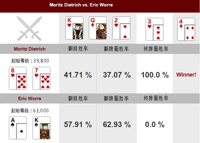 牌局背景 这是2016 WSOP主赛事中的一手牌。拿着8♥ 7♥ 的是德国选手Moritz Dietrich,曾三次打入WSOP赛事钱圈,总计拿到过91294刀WSOP赛事奖金。拿着A♣ K♠的是美国选手Eric Worre,曾两次打入WSOP赛事钱圈,总共拿到过70313刀WSOP赛事奖金。 对局过程 盲注150/300,前注25。Dietrich翻前在枪口位置加注到800,玩家A跟注,Worre再加注到2800,Dietrich跟注,玩家A也跟注。翻牌圈Dietrich选择check,玩家A也check,Worre下注6000,Dietrich跟注,玩家A弃牌。转牌圈Dietrich再次check,Worre下注18000,Dietrich全压,Worre跟注。 分析 在锦标赛的早期阶段,当你仅有一个对子时,要避免用AK在翻后游戏一个巨大的底池。谨记,一对在牌力排名中排位很低,不值得为之输光筹码。Worre在翻牌圈用一个较大的下注摆脱了一个对手,但Dietrich跟了进来。Worre应该一直在思考Dietrich可能拿到了什么牌。他可能想到的威胁是QQ、22还有A♥ Q♥ 这样的同花听牌。对手翻牌圈的跟注以及转牌发出的第三张红桃应该有足够的理由在转牌圈随后check。这种玩法可以隐藏Worre的牌力,同时也控制了底池的大小。这样Worre就可以在河牌圈少输一点。而且有时可以逮到88这样的牌所做的绝望诈唬。因此,Worre在转牌圈输了31000而不是在河牌圈输掉9000-15000。Dietrich最终拿到了第513名,奖金22648刀,而Worre因为在这手牌损失了63%的筹码,未能打入钱圈。