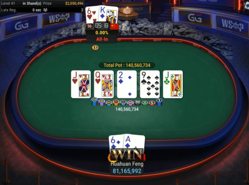 最终的单挑在两位中国选手冯华欢和Xue qiao Zhao之间展开,冯华欢拥有1.54亿,Xue qiao Zhao拥有6778万。单挑持续了五分钟便产生了本场比赛的冠军,最后一手牌Xue qiao Zhao在庄位拿到Kd6h加注400万,冯华欢大盲位3-bet1250万,Xue qiao Zhao 4-bet全下7003万,冯华欢跟注。公共牌:JhQh2d9sJc,最终冯华欢击败了Xue qiao Zhao获得了本场比赛的冠军,收获奖励211,282以及个人首条WSOP金手链。Xue qiao Zhao获得亚军,奖励159,705。
